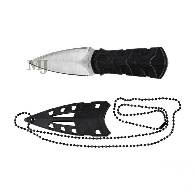 Dzięki antypoślizgowej polimerowej rękojeści sztylet pewnie i wygodnie leży w dłoni. Do bezpiecznego przenoszenia noża na szyi otrzymujemy lekką pochewkę z tworzywa sztucznego oraz metalowy łańcuszek kulkowy.
