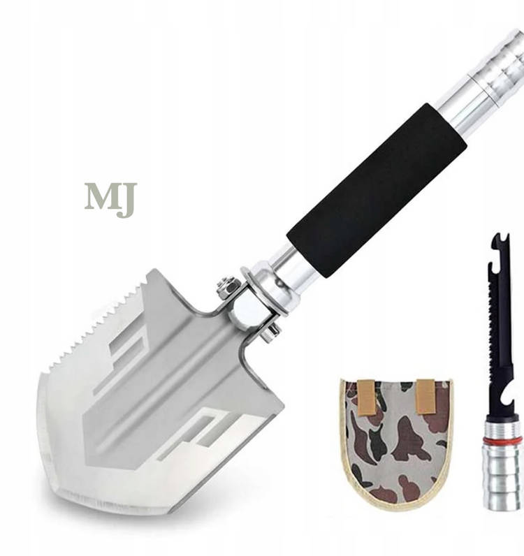 - Antypoślizgowa rękojeść, pokrowiec w zestawie, wielofunkcyjna, ząbkowana krawędź, kompas, motyka, nóż, piła.
