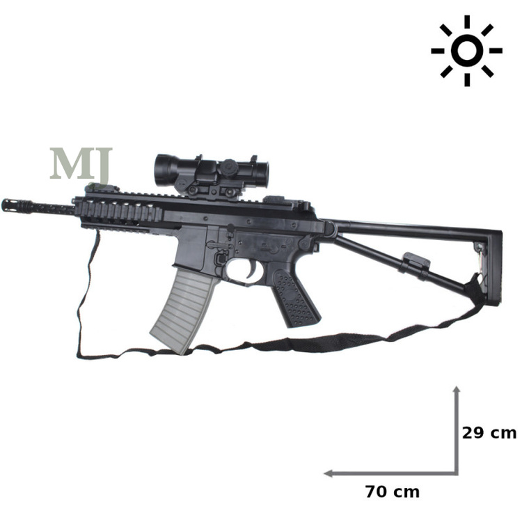 replika karabinu szturmowego w formie zabawkowej, która przeznaczona do strzelania plastikowymi kulkami. Karabin ma długość 70 cm i wysokość 29 cm, co jest pokazane za pomocą linii z wymiarami w dolnej części zdjęcia.