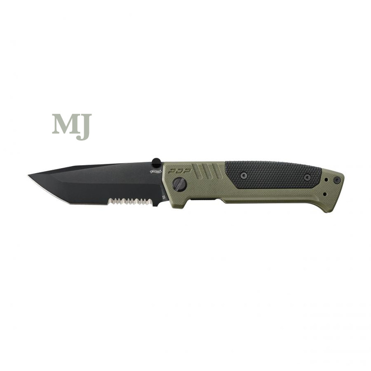 Nóż składany Walther PDP Tanto powstał z wysokiej jakości wyselekcjonowanych materiałów, a jego konstrukcja będzie atrakcyjna dla miłośników i pasjonatów noży oraz broni. Model wzorowany na bardzo udanej konstrukcji pistoletu Performance Duty. Model z okładzinami w kolorze zielono-czarnym będzie gratką dla myśliwych oraz miłośników bushcraftu i survivalu. Sercem foldera jest powlekane czarną powłoką ostrze o profilu Tanto, które częściowo jest ząbkowane i umożliwia bardzo dobre cięcie lin oraz pasów przy zachowaniu wysokiej przebijalności.