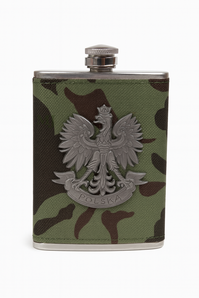Piersiówka moro z godłem Polski to połączenie elegancji, praktyczności i symboliki narodowej. Wykonana ze stali nierdzewnej, została obita wytrzymałą tkaniną w kamuflażu wojskowym, co nadaje jej charakteru i wyjątkowego stylu. Na froncie znajduje się klasyczny polski orzeł w koronie, wykonany z metalu w srebrnym, stalowym odcieniu – trwały i efektowny.