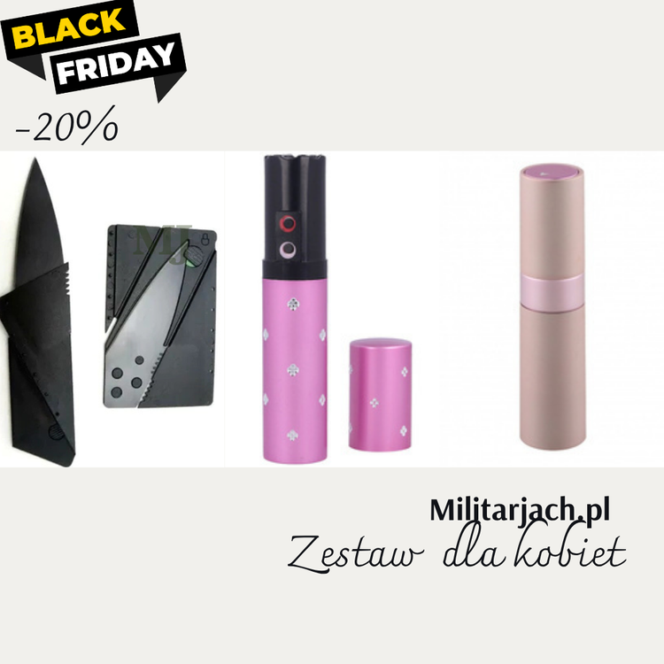 - Stylowy zestaw samoobrony dla kobiet: gaz pieprzowy, paralizator-latarka i nóż rozkładany składany karta . Dyskretna ochrona w kobiecym wydaniu od Militarjach.pl.