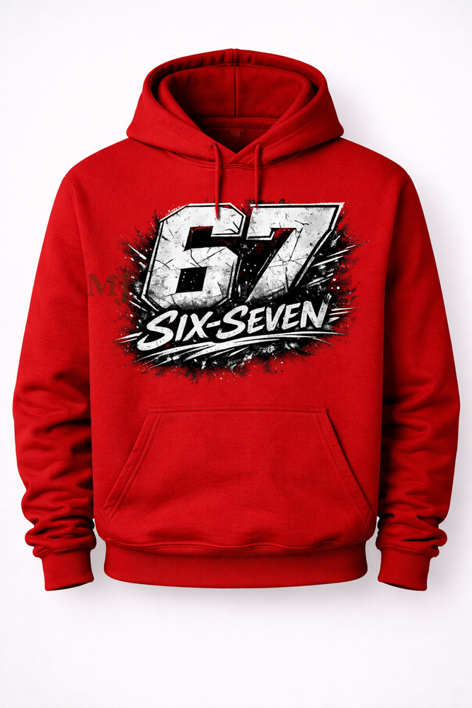 - Bluza z kapturem six-seven inspirowana popularnym memem „67”. Mocny nadruk, czerwony kolor i streetwearowy vibe. Idealna dla tych, którzy łapią internetowe trendy i lubią styl z dystansem.